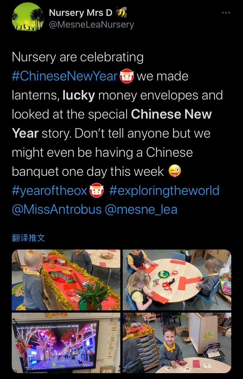 “幼儿园正在庆祝即将到来的中国春节,我们制作了灯笼、红包,还看了中国春节的故事。我们这周可能会举行中式宴会。”