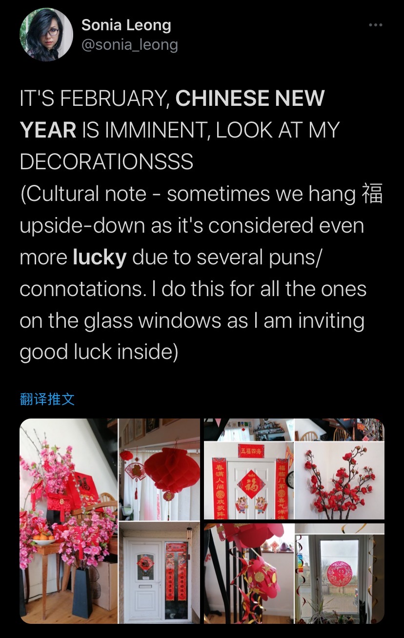 “现在是2月,中国春节马上就到了,看我的装饰!有时候我们把‘福’字倒挂,是‘福到了’的意思,我在所有窗户上都贴了‘福’字,因为我希望自己会更加幸运。”