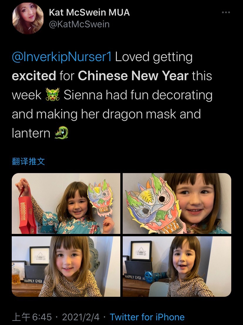 “(我们)为这周即将到来的中国春节感到兴奋!西耶娜做了龙的面具和灯笼,玩得很开心。”