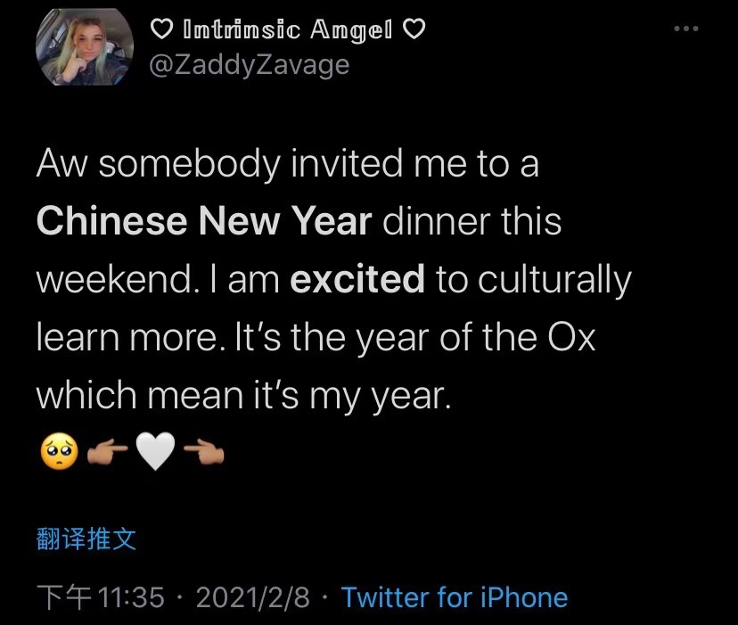 “有人邀请我这周参加一个中国春节的晚宴。我很开心兴奋能学习到更多(中国)文化,今年是牛年,也是我的本历年。”