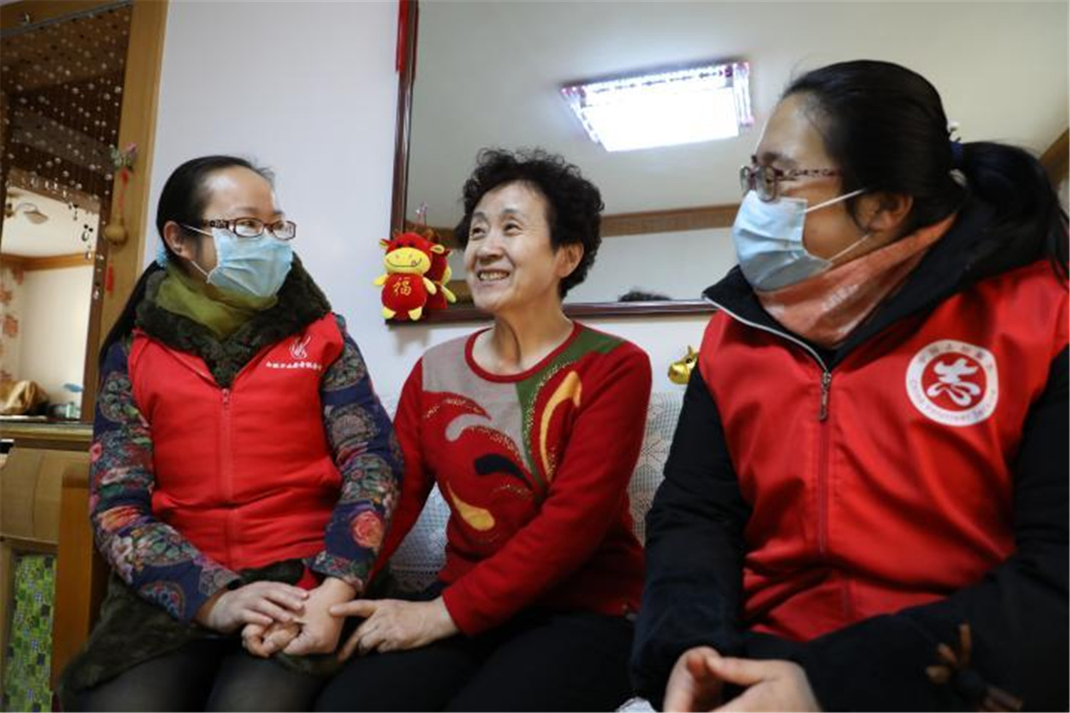 社区工作人员孙微玲(左一)、狄维娟(右一)为周桂珍送来年货和春联。新华社记者任延昕 摄