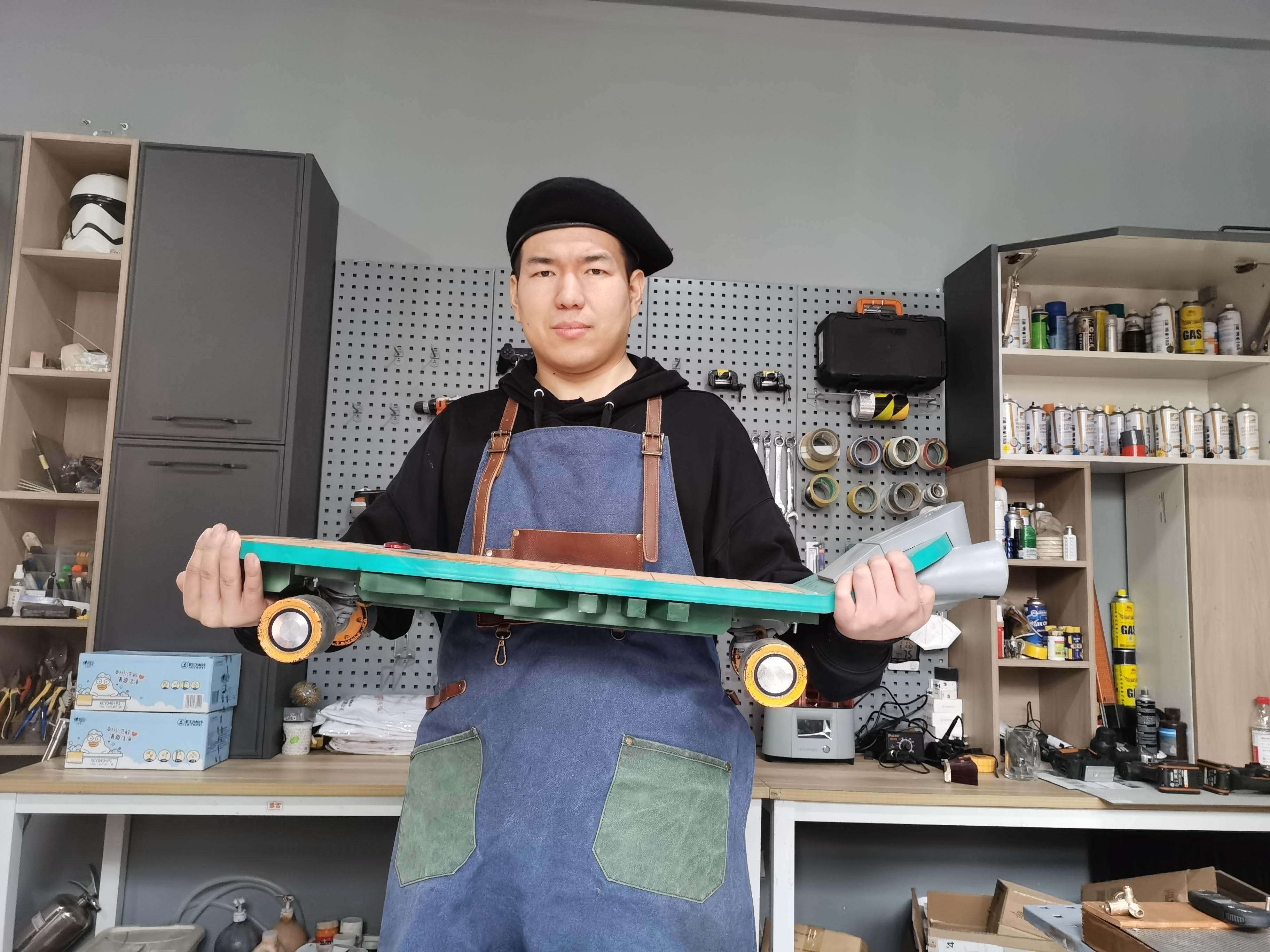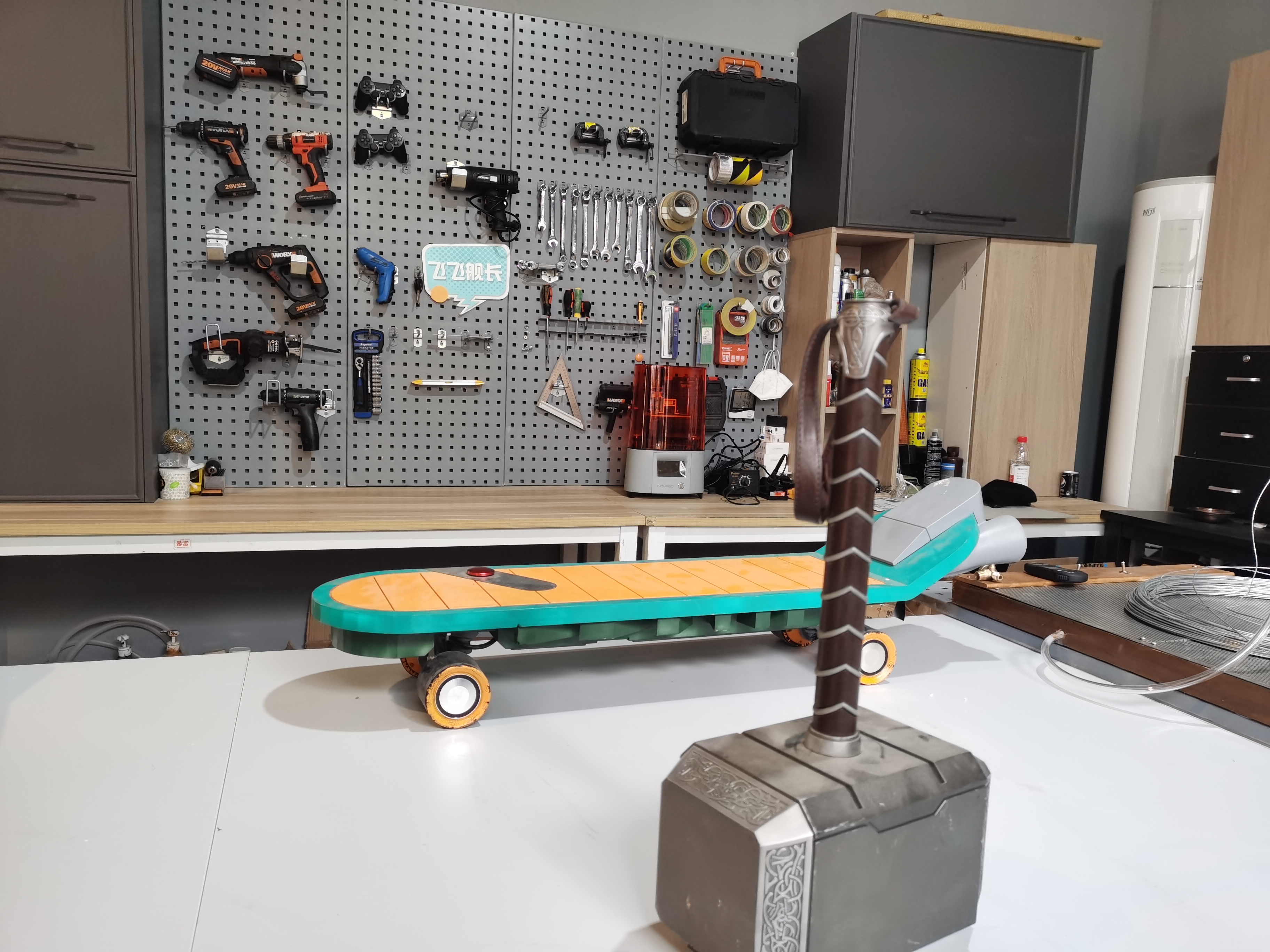 王飞制作的作品包括柯南的滑板、漫威电影里的雷神之锤等。新华社记者陈尚营摄