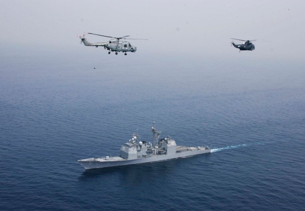 2009年3月11日,在巴基斯坦南部卡拉奇港附近的阿拉伯海举行的“和平-09”多国军演实兵演习中,两架直升机从美国海军“张伯伦湖”号巡洋舰上空飞过。(新华社记者查春明摄)