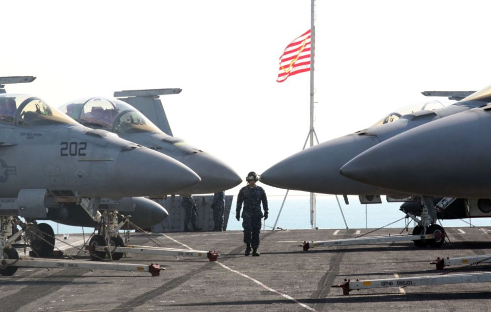 2011年1月11日,在韩国釜山停泊的“卡尔·文森”号航母上,一名士兵从战斗机前走过。(新华社发,朴真熙摄)