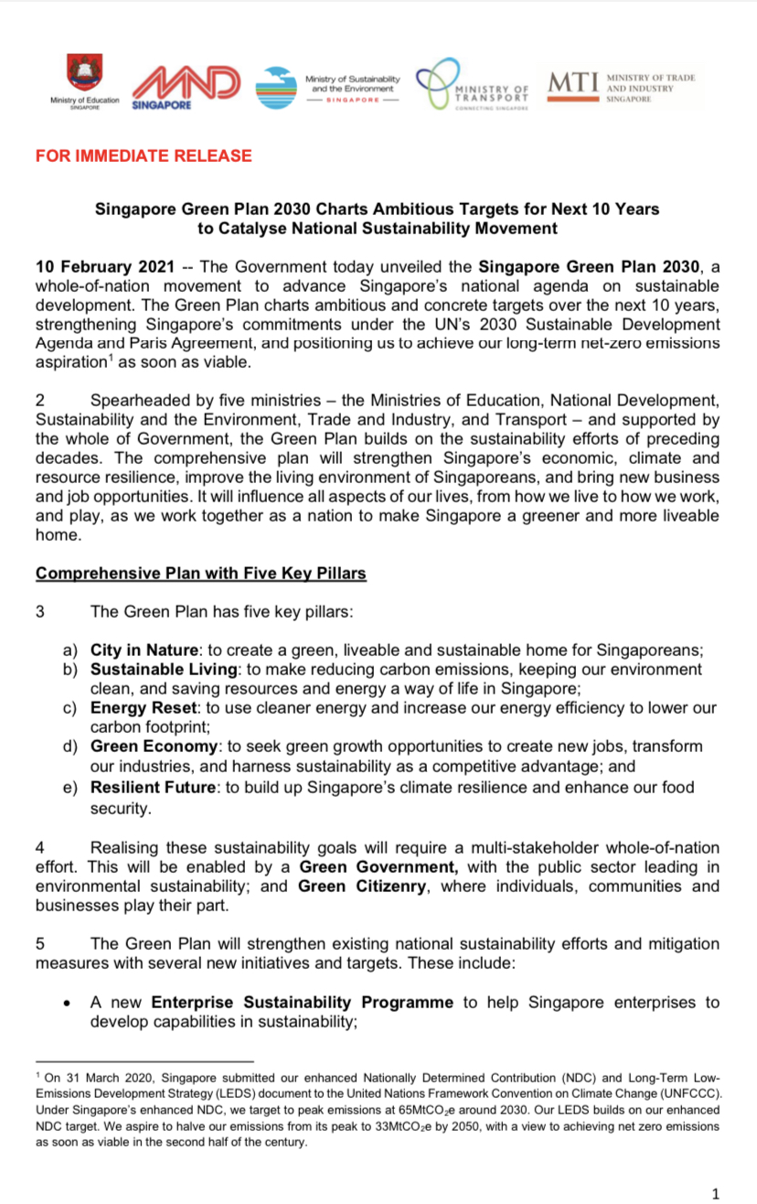 新加坡政府10日公布了2030年新加坡绿色发展蓝图,在城市绿化、可持续生活和绿色经济等方面制定明确目标,希望推动公共领域、企业和个人在未来10年朝永续发展的目标迈进。