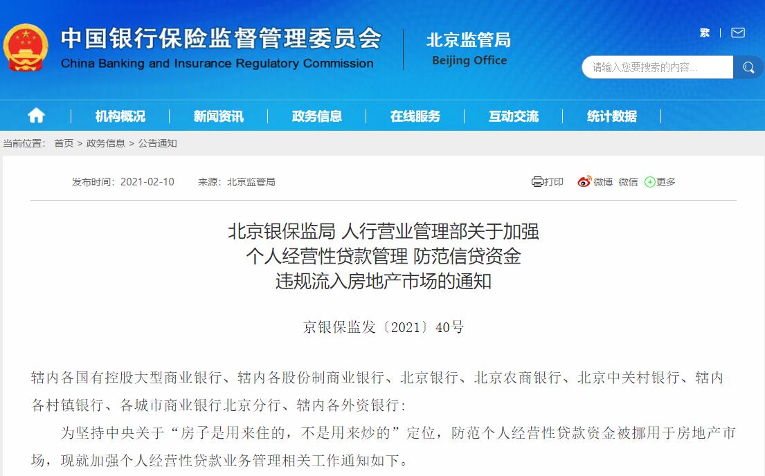 今日(2月10日),北京银保监局、人行营业管理部发布关于加强个人经营性贷款管理、防范信贷资金违规流入房地产市场的通知。通知要求如下:
