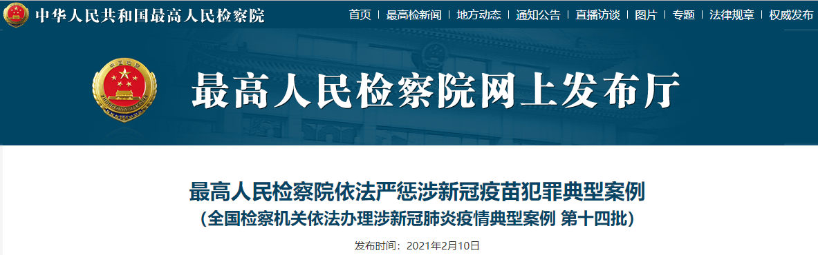 为依法严惩新型涉疫犯罪,最高人民检察院今天(10日)发布了4起涉新冠疫苗犯罪典型案例。