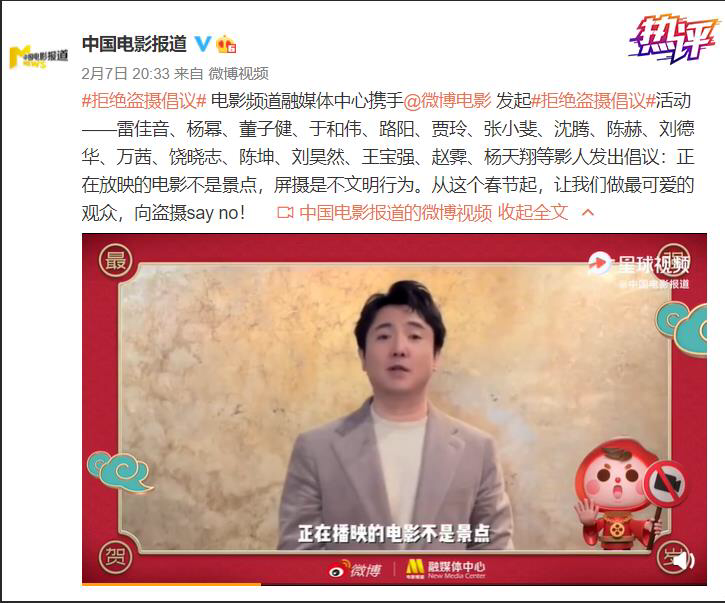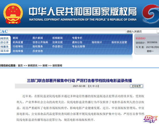 对于“盗摄”行为,中宣部版权管理局、中宣部电影局、公安部食品药品犯罪侦查局,已于近日联合部署开展了院线电影版权保护的集中行动,严厉打击春节档院线电影盗录传播等违法犯罪行为,规范电影市场版权秩序。对权利人意见强烈、社会危害大的案件,将依法从重处罚。