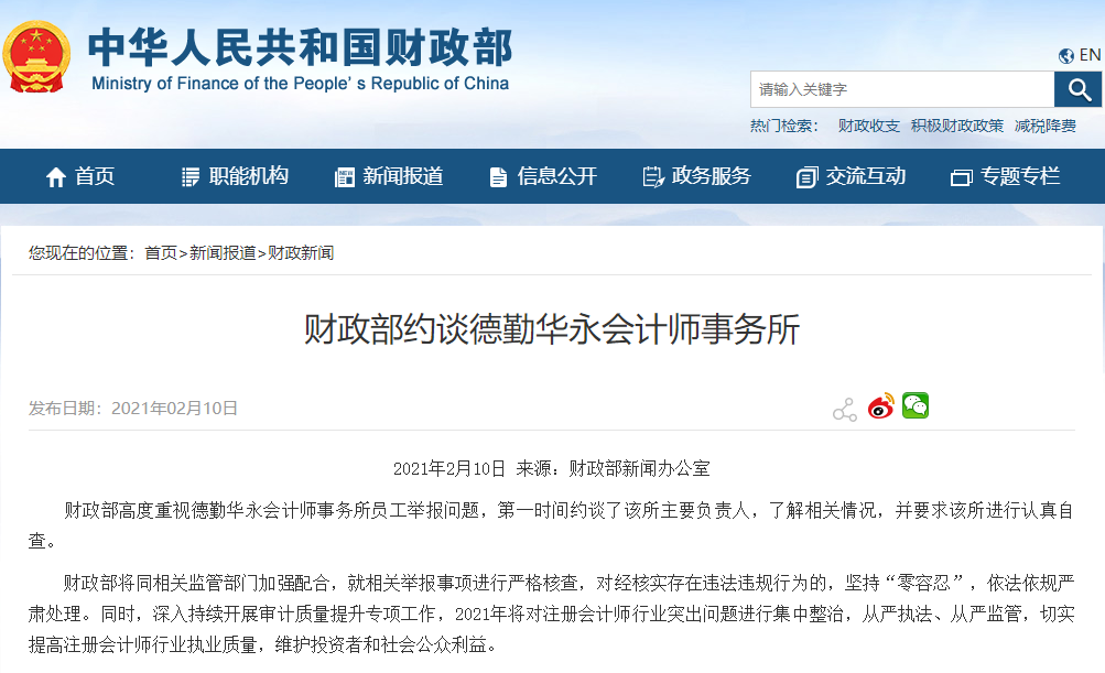 10日,财政部新闻办公室表示,财政部高度重视德勤华永会计师事务所员工举报问题,第一时间约谈了该所主要负责人,了解相关情况,并要求该所进行认真自查。