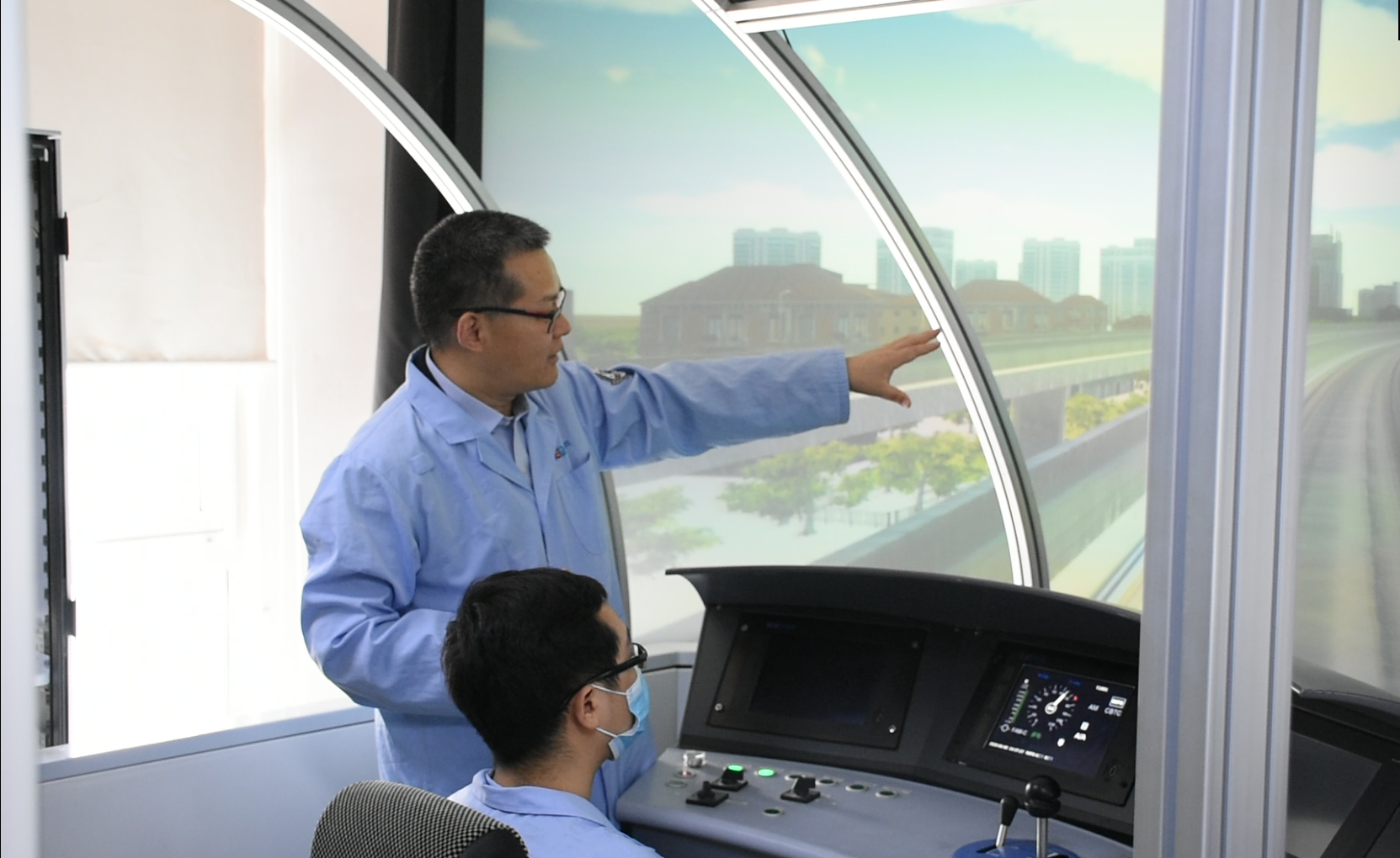 郜春海(站立者)在列车模拟驾驶台前指导工作。(新华社记者邰思聪摄)