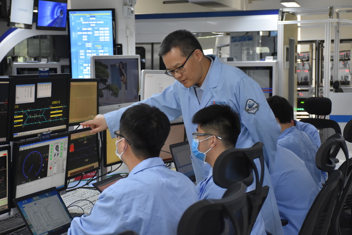 郜春海(站立者)在仿真测试平台前指导。(新华社记者邰思聪摄)