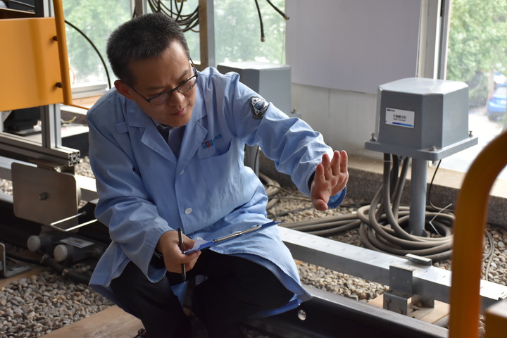 郜春海在轨道设备处进行试验。(新华社邰思聪摄)