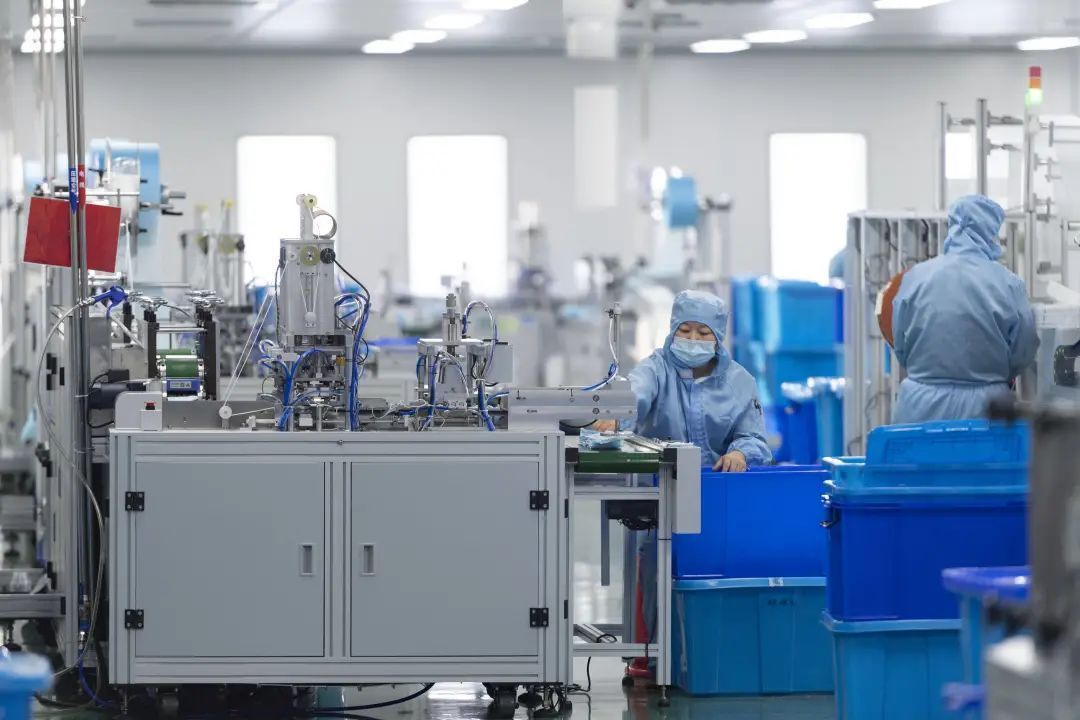 在医疗器械生产企业,工人在口罩生产车间忙碌
