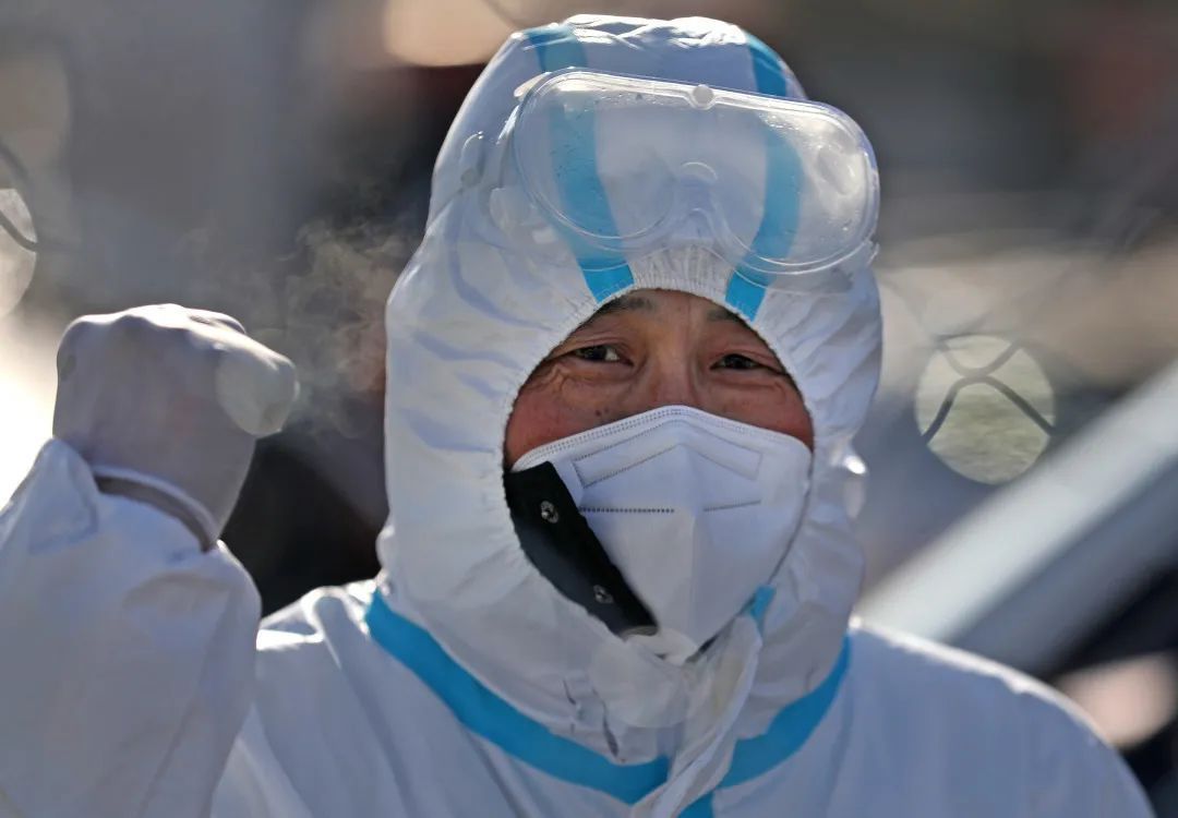 管控区域出入口处,工作人员在寒风中做出加油的手势