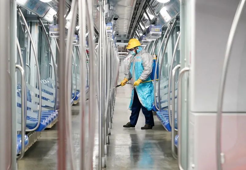 地铁工作人员在车厢内消毒