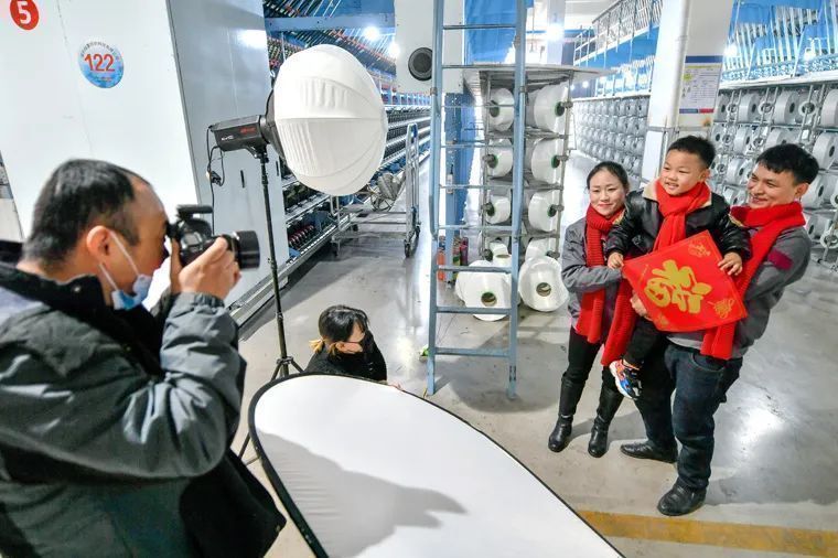 企业车间内,志愿者为纺织工家庭拍摄新年全家福