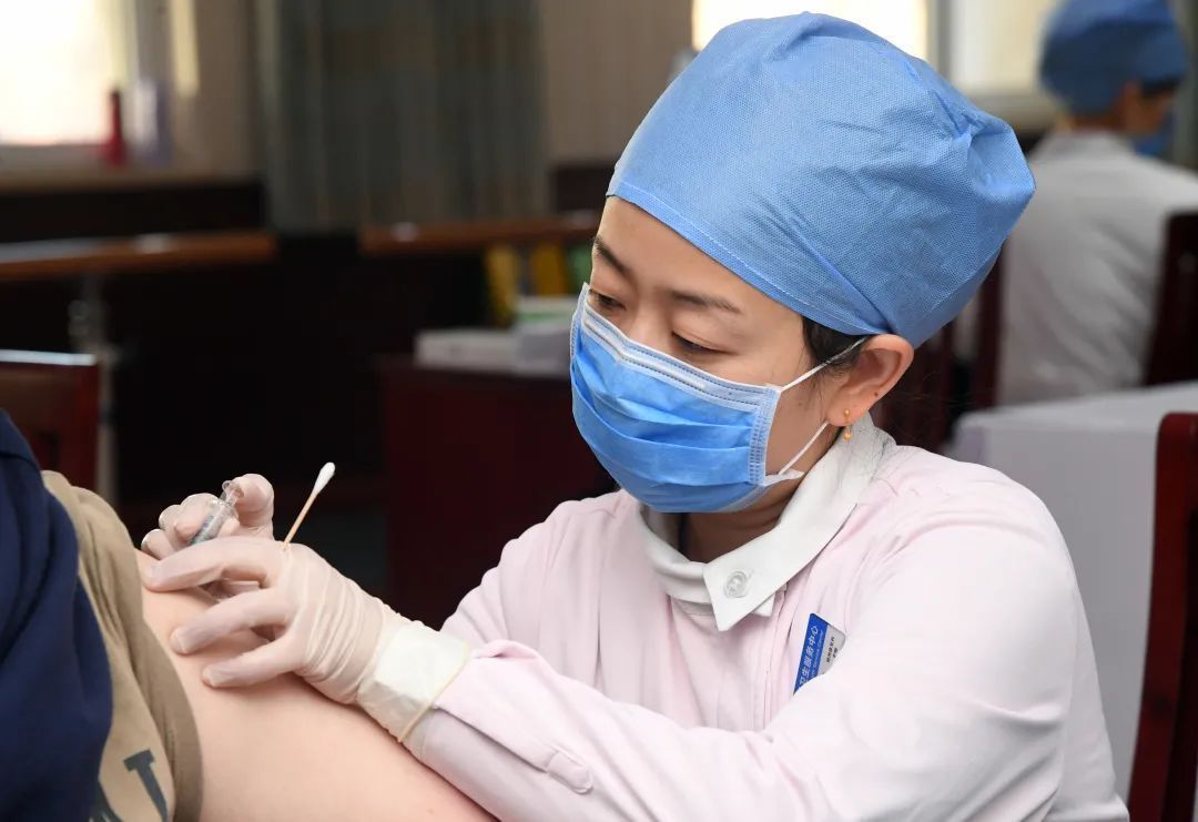 医护人员为接种人员注射新冠疫苗