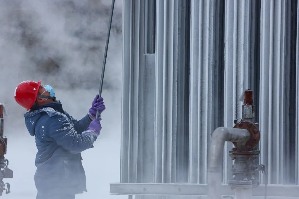 工作人员对液化天然气储备站的气化器设施进行除冰、除霜作业