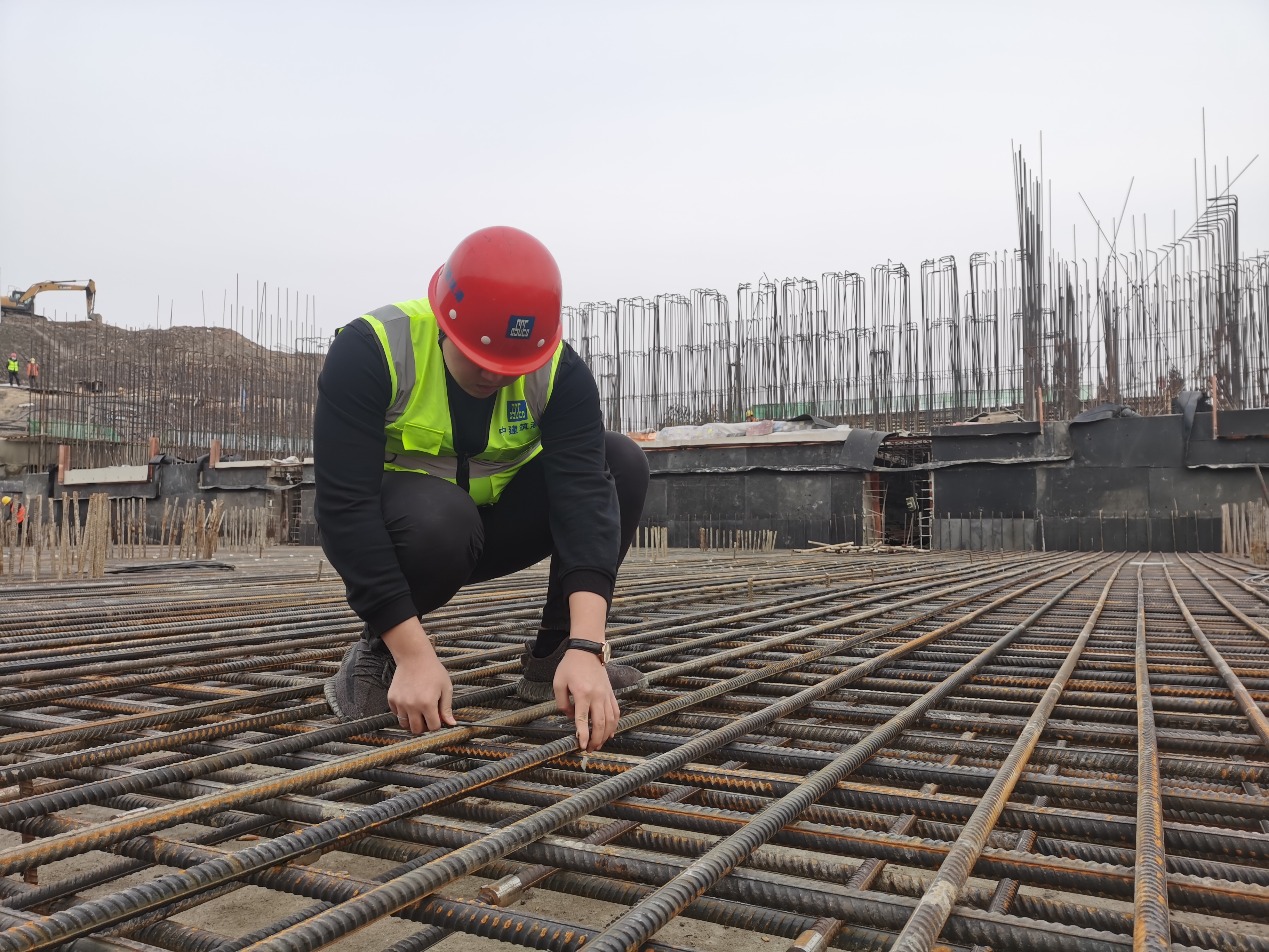“钢筋丛林”里,张载伟和工友们完成绑扎,年轻的陈鹏伊会在现场测距,看绑扎是否符合要求。穿着反光衣、戴着安全帽,让人很难看出陈鹏伊刚刚24岁。