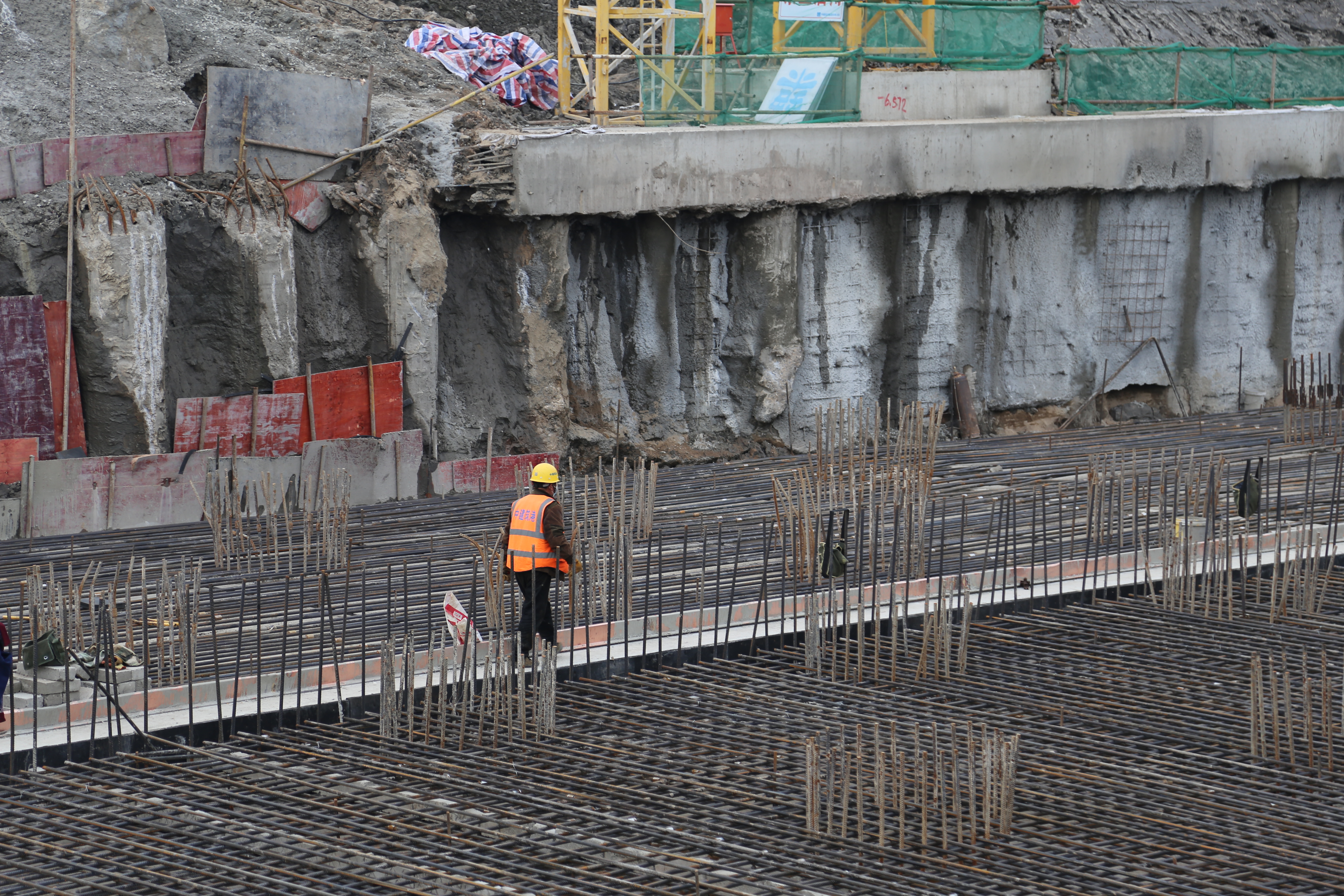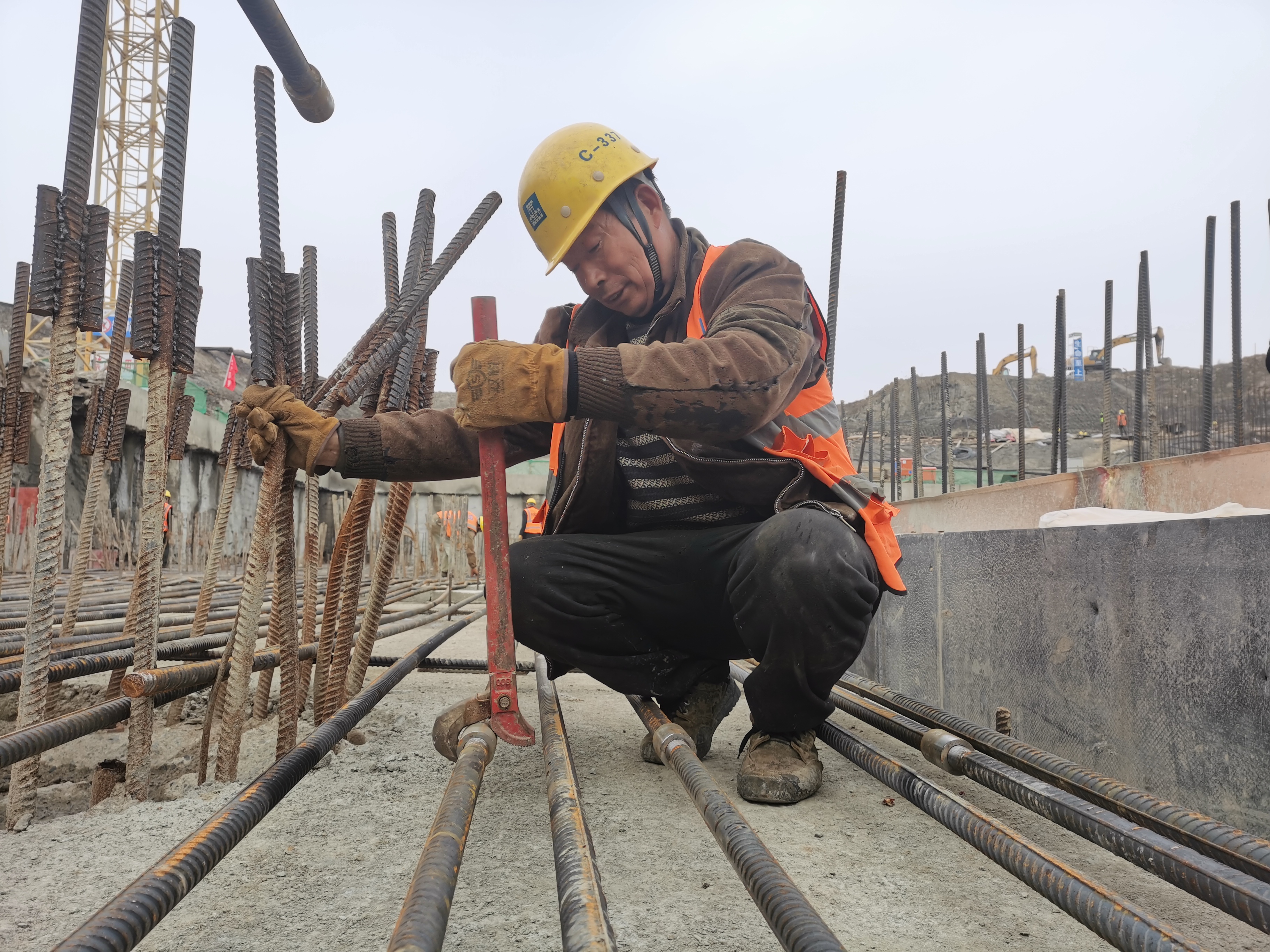 腊月二十九,57岁的张载伟和平日里一样,在一个巨大的平台上做钢筋绑扎,他工作的地方,建成后是一个船闸。站在高处望下去,现在的工地像是一个“钢筋丛林”。