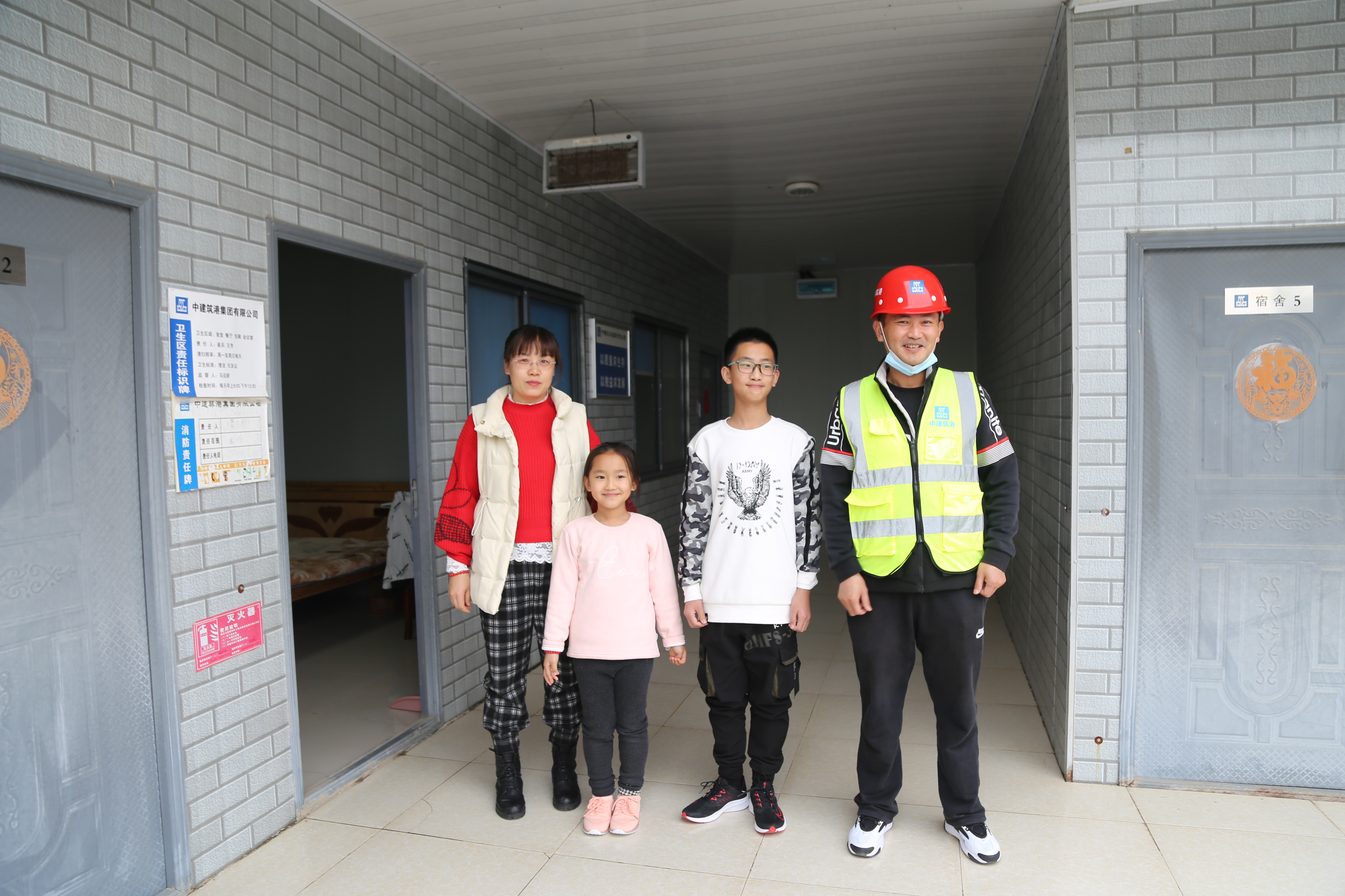 高运平(右一)一家在项目部的“卧室”前合影。 新华社记者陈尚营 摄