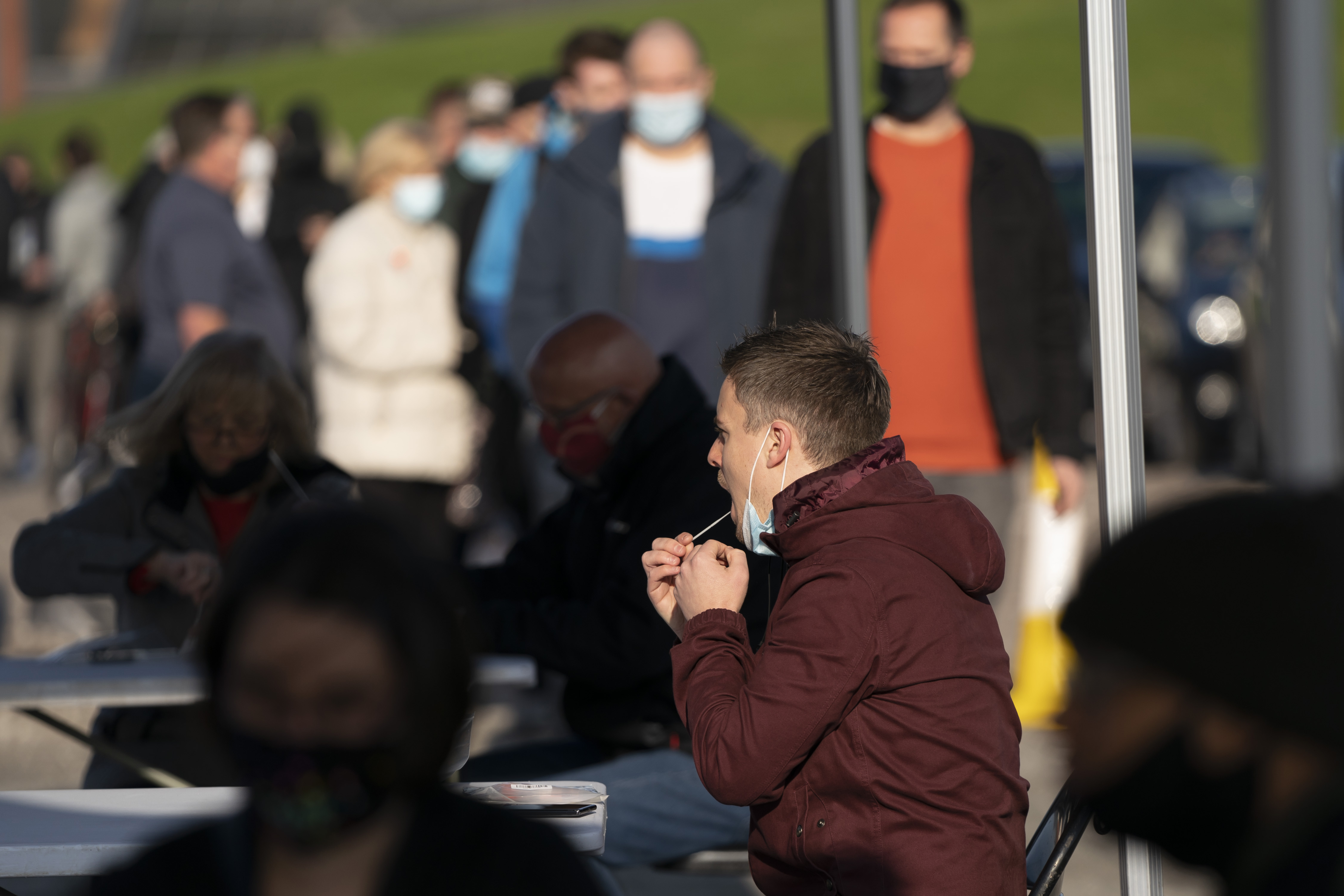 图为2020年11月6日,一名男子在英国利物浦的一处新冠病毒检测点采样。(新华社发,乔恩·休珀摄)