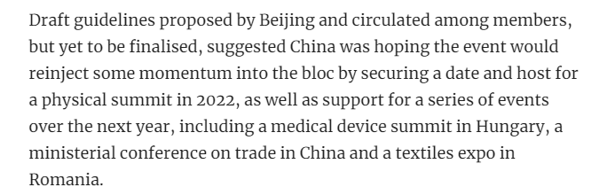 《南华早报》网站8日报道说,未来一年内,中国将支持举办一系列活动,包括在匈牙利举行医疗设备峰会,在中国召开各国贸易部长级会议和在罗马尼亚举行纺织品博览会。