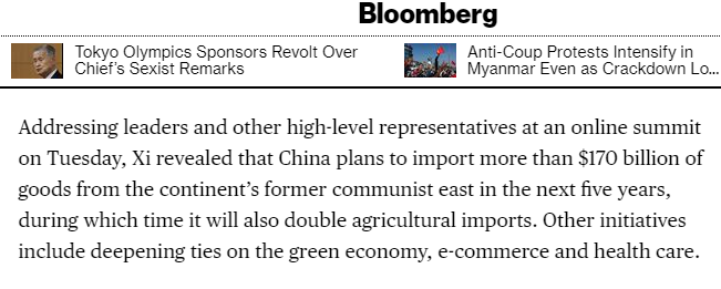 报道援引中国商务部数据说,2020年中国和中东欧17个国家的双边贸易额首次超过1000亿美元,达到1034.5亿美元,同比增长8.4%,高于同期中国对外贸易增幅和中欧贸易增幅。据介绍,2012年以来,中国与中东欧17国贸易年均增速达8%。