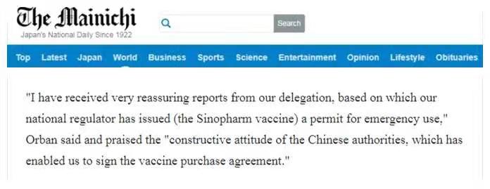 日本《每日新闻》10日的报道称,匈牙利总理欧尔班在峰会上称赞中国科学界为研制新冠疫苗所付出的努力,称从匈牙利专家方面收到了有关中国疫苗“非常令人放心的报告”。