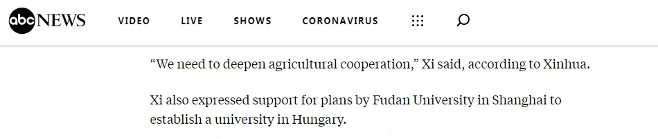 美国广播公司网站10日关注了中国与中东欧国家在文化、教育领域的合作。报道说,“中国支持复旦大学在匈牙利开设校区”。