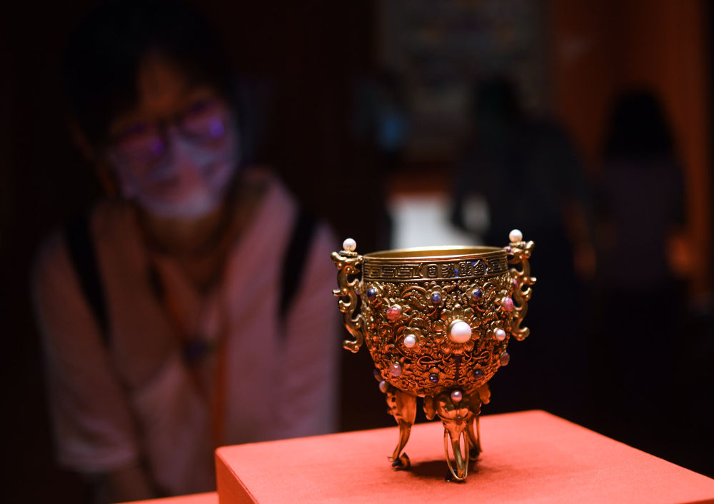 这是金瓯永固杯(故宫博物院收藏)。清代自雍正帝起有一个重要的新年仪式——明窗开笔礼。皇帝要在养心殿明窗,亲燃蜡烛,然后把祛邪扶正的屠苏酒注入酒杯后,边心中默祷边饮酒,再用御笔在红纸上写下心中所愿的吉祥话,以祈求新年风调雨顺、国泰民安。 新华社记者 金良快 摄