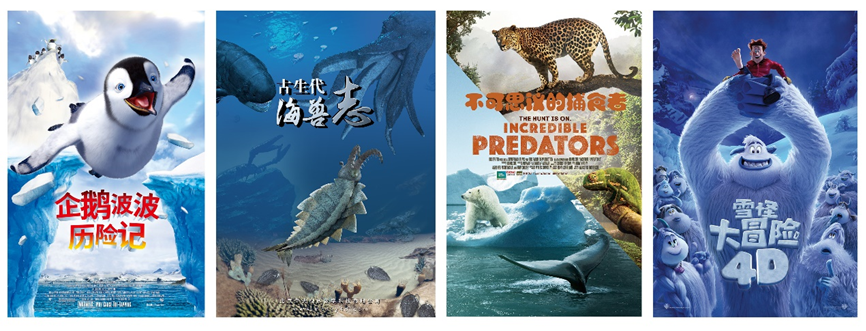 春节期间,中国科技馆球幕影院、巨幕影院、4D影院和动感影院四座特效影院也将全面对观众开放。每天共排映特效电影27场,上映影片15部,涵盖航空航天、动物科学、环境保护、科幻动画等众多类型。包括全新影片《古生代海兽志》、自然纪录片《不可思议的捕食者》和两部冰雪题材动画片《雪怪大冒险》《企鹅波波历险记》。
