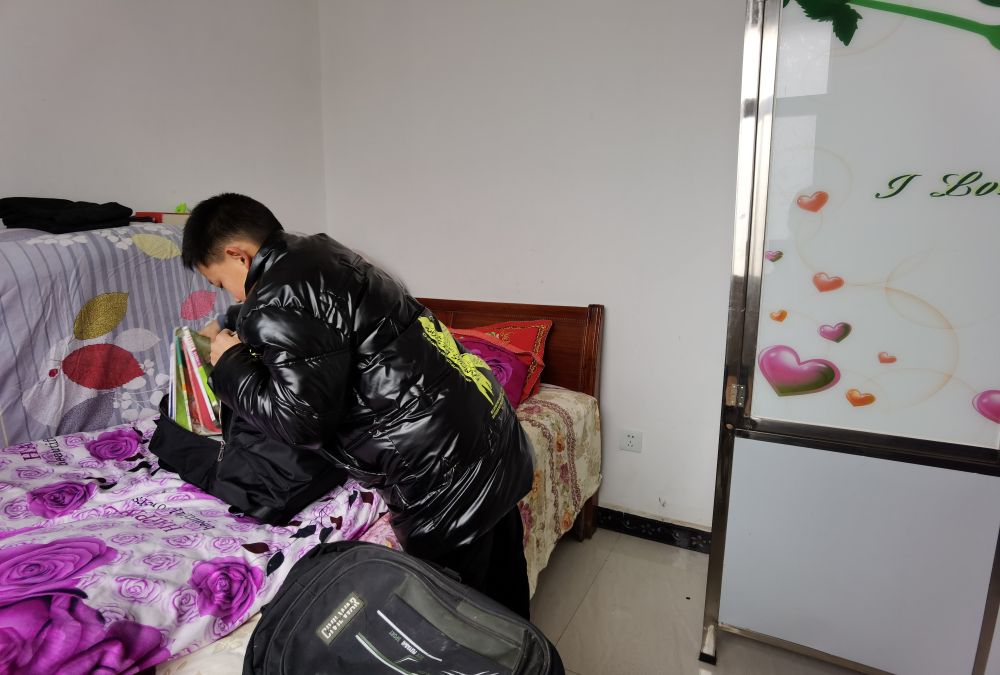 (小傲小心翼翼地将书本装入新书包。新华社记者张紫赟摄)