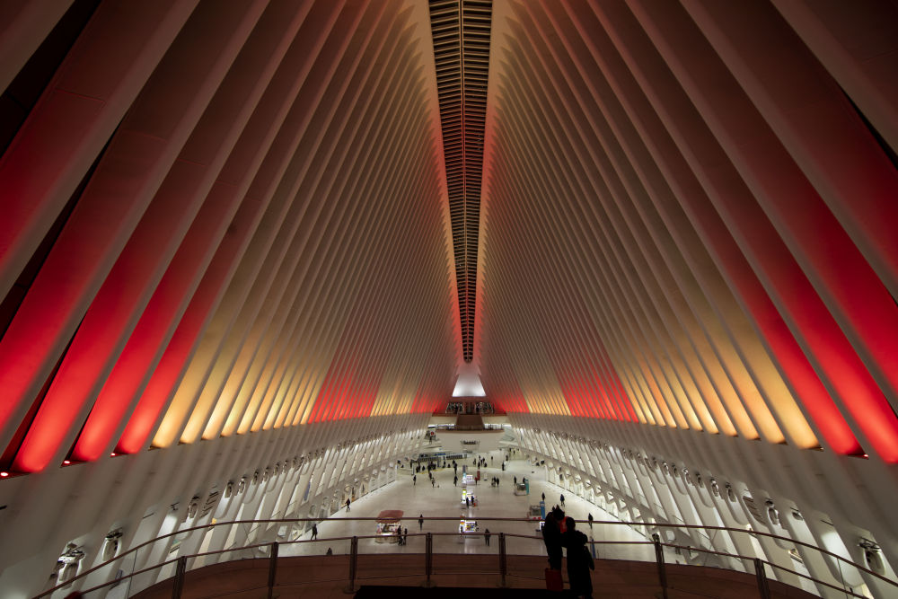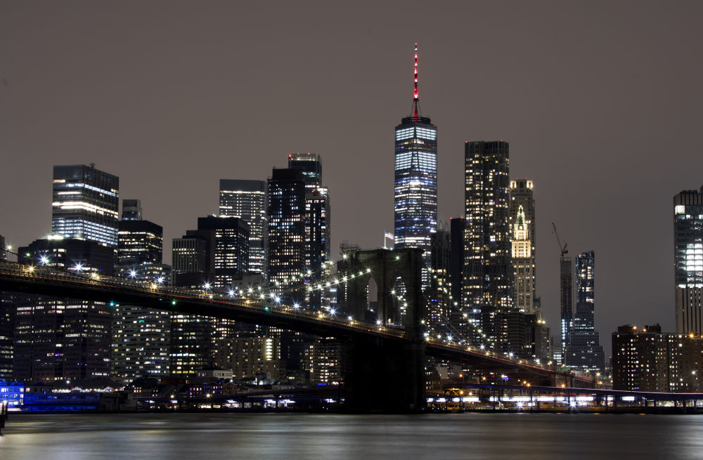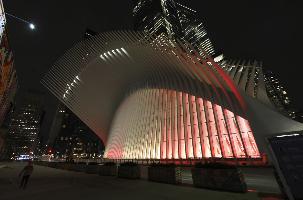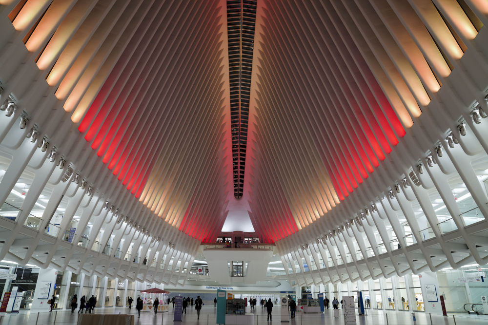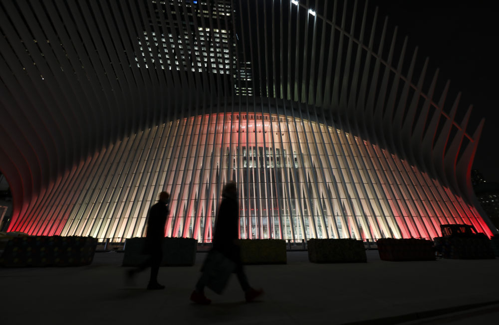 ↑2月10日,美国纽约世贸中心一号楼亮起红色的灯光。