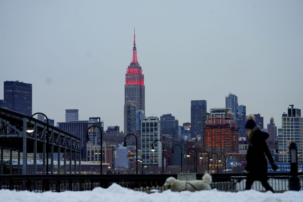 ↑2月10日,美国纽约帝国大厦亮起红色灯光。