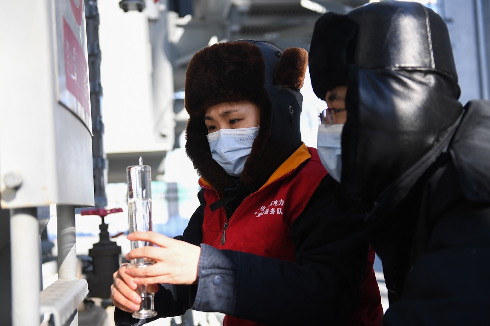 2月8日,在胜利站,检修员工张晶(左)和同事一起巡检(新华社记者刘磊摄)