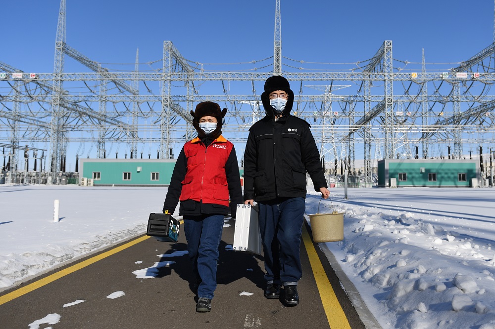 2月8日,在胜利站,检修员工张晶(左)为特高压设备提取油样,准备做实验检测设备运转情况(新华社记者刘磊摄)