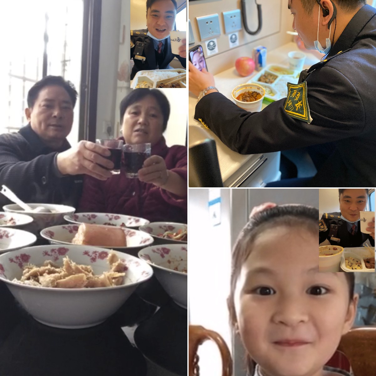 列车长李朋林在高铁上和家人“云团年”。(拼版图片)