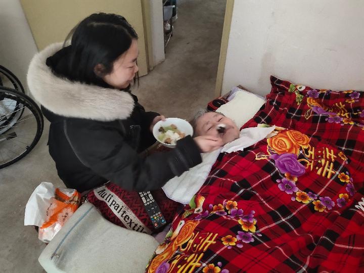 肖燕给生病卧床的幺爷爷喂饭。采访对象供图