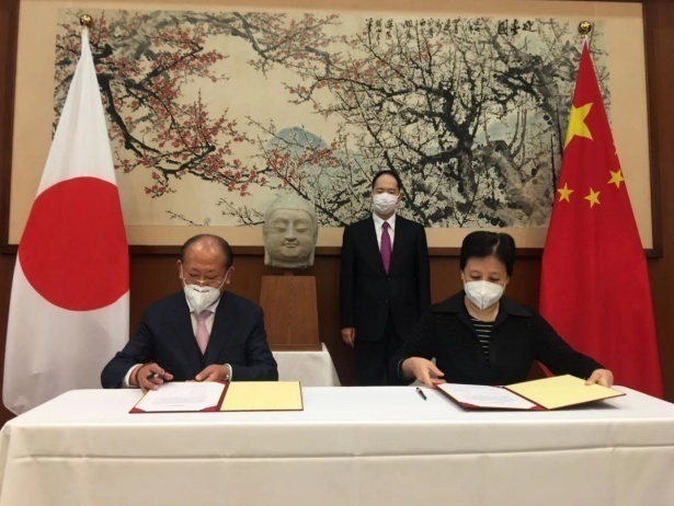 11月17日,我驻日使馆举办文物移交仪式,张荣先生(左)将持有的天龙山石窟佛首无偿捐赠给中国国家文物局,移交使馆保管。图为驻日使馆公使杨宇(中)见证,公使衔参赞石永菁(右)与张荣签署捐赠文件。国家文物局供图