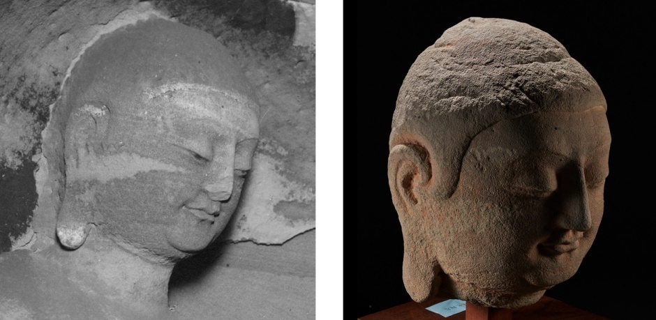 岩田《天龙山石窟》图版41截图(左图),佛首回运后拍摄的高清图片(右图 罗征/摄) 国家文物局供图