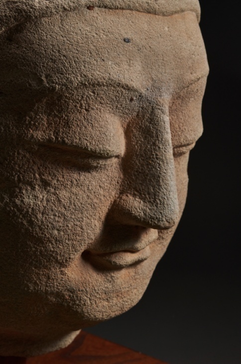 佛首长33.7厘米,宽30.4厘米,高44.5厘米,重55.5公斤。科技检测的测试分析结果表明,佛首石材主要由石英和方解石构成,符合天龙山岩体特征,内部一致性较好,无显著裂隙发育。顶部和耳部发现彩绘痕迹,推断佛像原始状态应有彩绘。鼻翼及鼻梁部位存有有机材料,推断有修复经历,与鼻翼修整情况相契合。