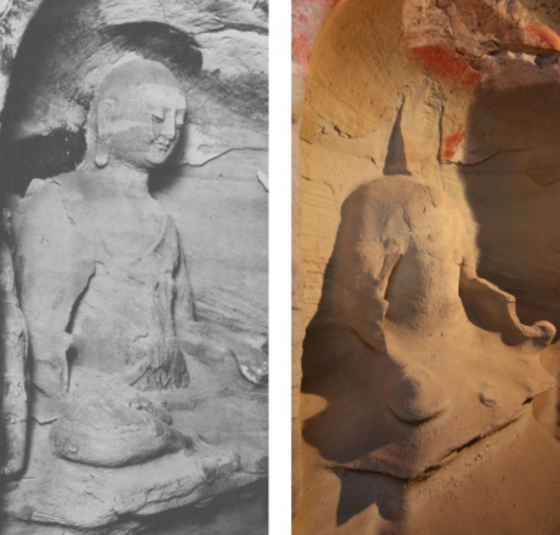 外村太治郎《天龙山石窟》相册集图版35(第8窟北壁龛内佛像)(左图),天龙山石窟第8窟北壁佛龛主尊佛像现状(右图)国家文物局供图