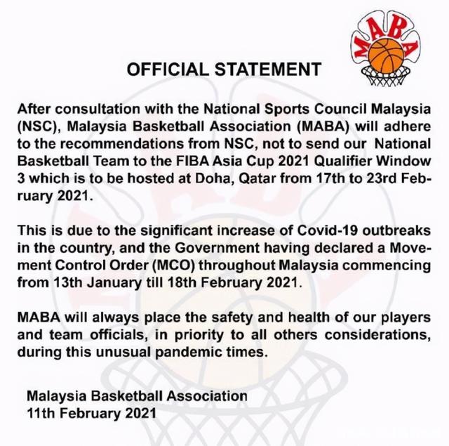 声明表示,疫情当前,马来西亚篮协把球员和球队官员的安全和健康置于所有其他考虑之上。