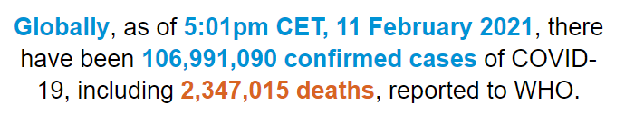 根据世卫组织最新实时统计数据,截至欧洲中部时间2月11日17时01分(北京时间2月12日0时01分),全球累计新冠肺炎确诊病例106991090例,累计死亡病例2347015例。11日,全球新冠肺炎确诊病例新增413858例,死亡病例新增12787例。(总台记者 朱赫)