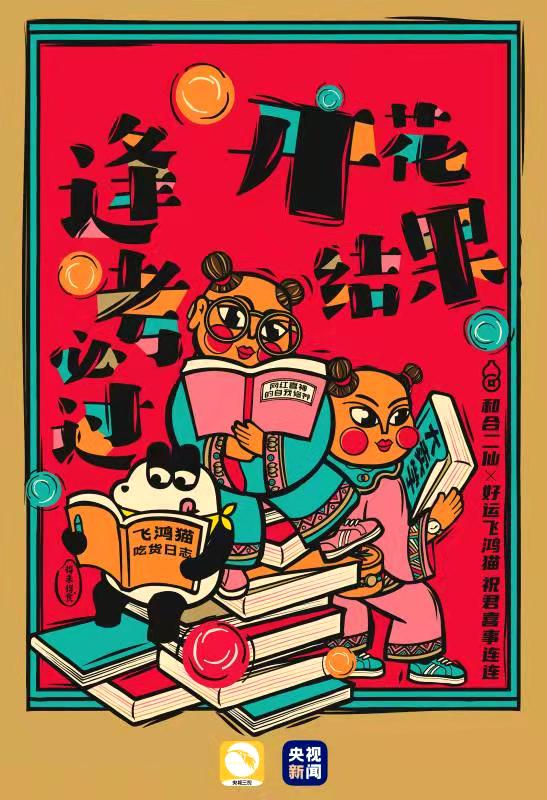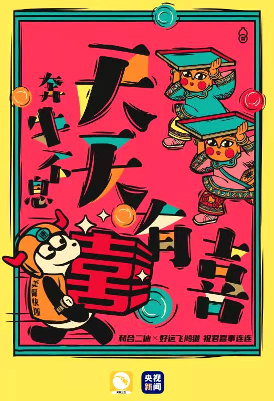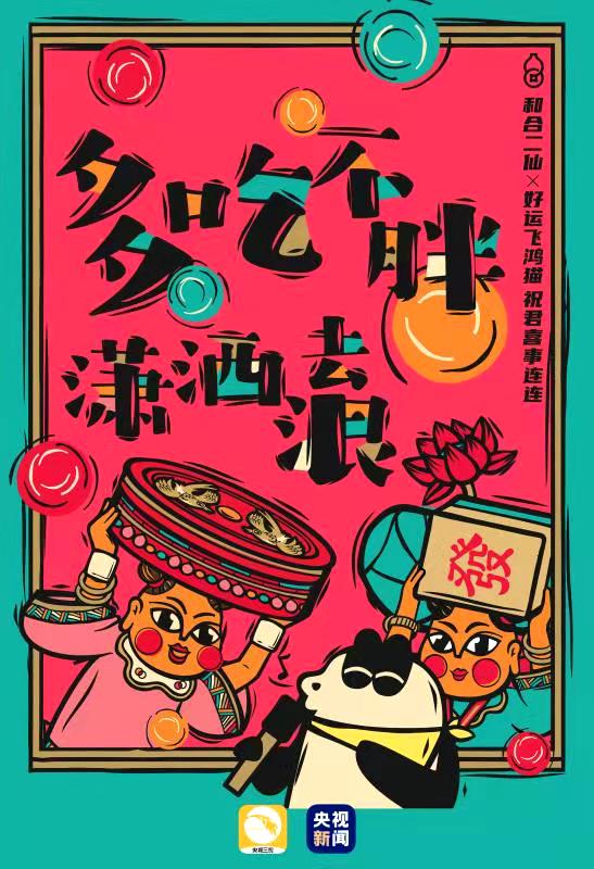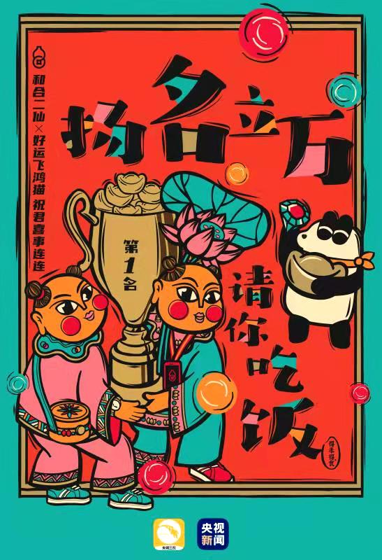 佛山设计师周掌柜选取佛山木版年画传统人物——和合二仙进创作国潮年画。和合二仙是推崇和睦有爱的民间喜神,手持荷花、竹盒,寓意“和合”“和谐”。