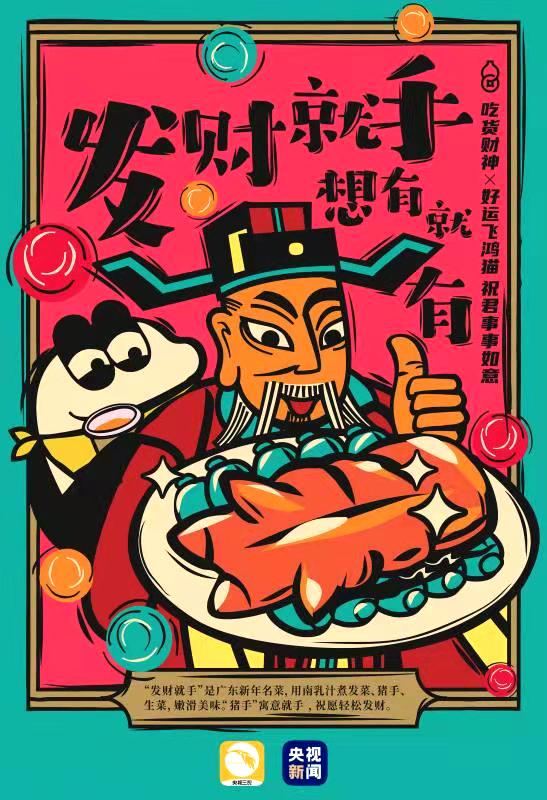 作品保留了佛山木版年画传统四色,以及年画人物的脸部、服装特征,同时结合卡通IP飞鸿猫、外卖小哥、佛山美食等现代生活元素,以创新年画助力非遗传承,传达“家和万事兴”的传统精神。