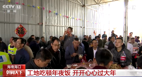 在海南海口江东新区的一个飞机维修项目工地,为了确保这个海南自贸港建设早期落地的重点项目今年3月完工,340多名工人坚守一线春节期间不停工。大年三十,项目部请留守在工地的工友吃了一顿丰盛的年夜饭,为了不影响工人晚上观看春晚,特意把年夜饭安排在除夕中午举行,让这些来自全国各地的农民工兄弟开心快乐过大年。