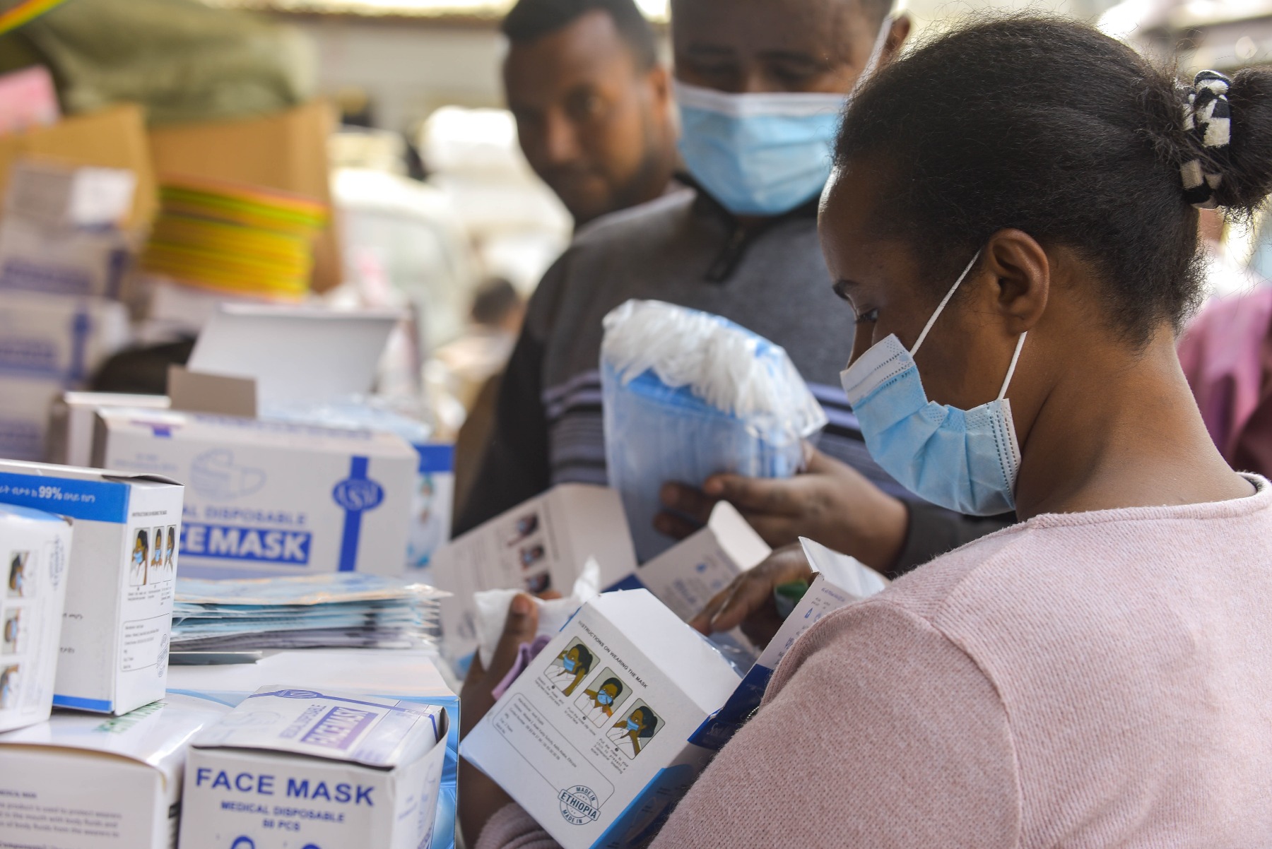 1月9日,在埃塞俄比亚首都亚的斯亚贝巴,一名女士在街上购买口罩。(新华社发,迈克尔·特韦尔德摄)