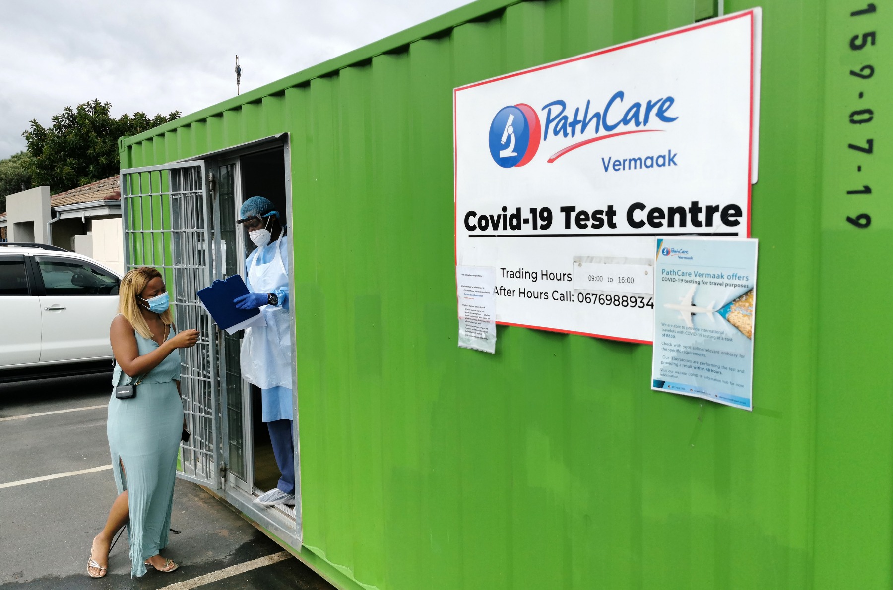 2月1日,医护人员在南非约翰内斯堡一处新冠病毒检测点为一名女子讲解检测步骤。(新华社记者陈诚摄)